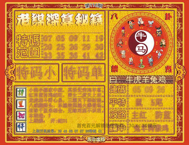 | 116期:平特一尾--《6666尾》--开:猴46准 |